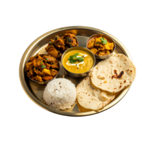 Balanced meal with roti, rice, dal, vegetables, and curd. Include protein and fiber.