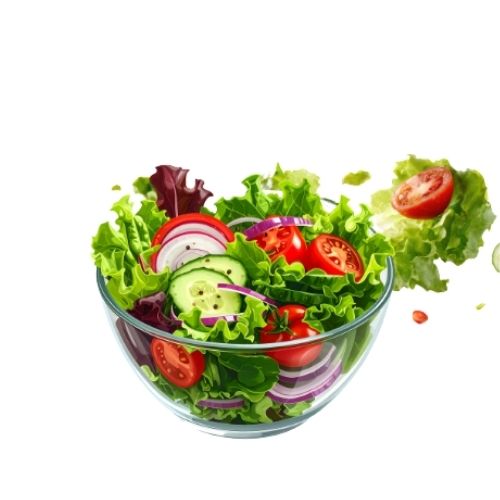 Fresh salad with cucumber, tomato, carrots, and leafy greens with lemon dressing.
